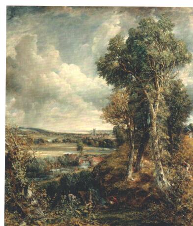 In contrast, the texture of The Vale of Dedham is anything but smooth. Constable’s brushstrokes are small, quick, and three-dimensional. One can see layers of paint stacked on top of one another, even in this low-quality scan of a postcard. Lots of brushstrokes create highly textured trees. Though both scenes portray grey clouds, they are more ominous in The Vale of Dedham because of their rough edges and layers of dark color. Layering paint gives the sky the appearance of a storm lurking just above the skyline, while the puffy grey clouds in River Landscape are simple and unsuspecting. The difference in texture creates a more unsettling mood. It is not that The Vale of Dedham is a dark landscape illustrating the terrors of nature- rather, there is the sense of something brewing. The village is closer in this painting than in River Landscape. Actual buildings can be detected. The winding branches of the tree in the foreground seem to be bracing themselves for something. Perhaps a storm, or maybe, the currents of industrialization. Painted in 1827, The Vale of Dedham depicts nature amidst the Industrial Revolution in England. If River Landscape with a View of a Distant Village and The Vale of Dedham feel different despite their similar subjects, it is because the role of the farm changed so rapidly between Gainsborough and Constable’s eras.