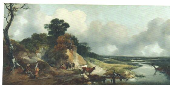 The most striking difference, in my opinion, is the texture of the surface. River Landscape is startlingly smooth. Invisible brushstrokes weave together the stormy grey clouds with white ones and a soft blue sky. The trees have similar consistency to the hills, the road, and the hide of the cows. This smooth handling of surface renders River Landscape a serene farming scene, a love letter to nature and the quiet stillness of the countryside. A village is visible in the distance, but it is almost indiscernible, and does not disrupt the effect of the painting. Gainsborough painted River Landscape in 1748, before the Industrial Revolution gained momentum in England.